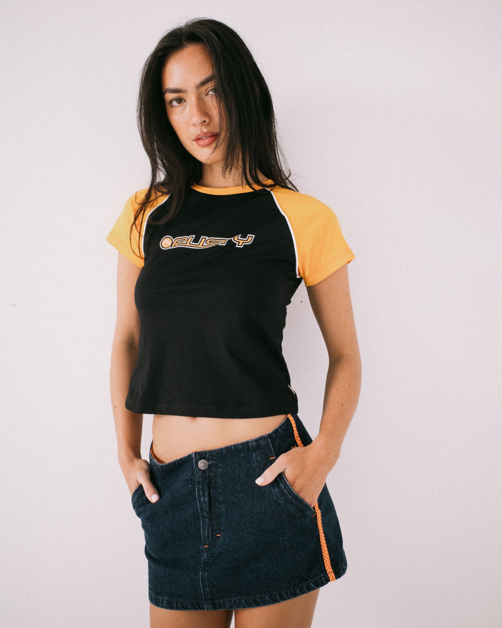 Schmal geschnittenes Kurzarm-Baby-T-Shirt mit Siebdruck auf der Vorderseite.