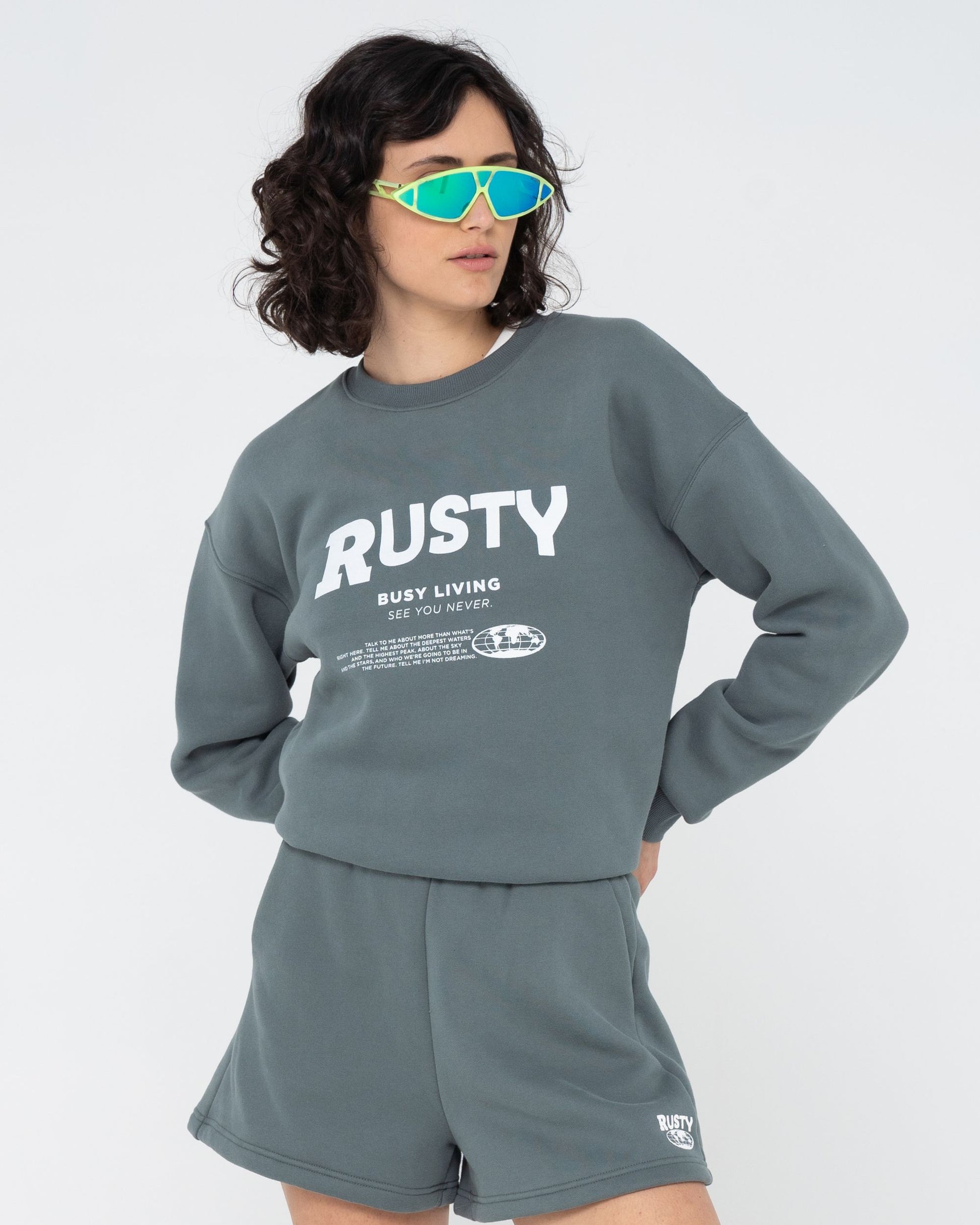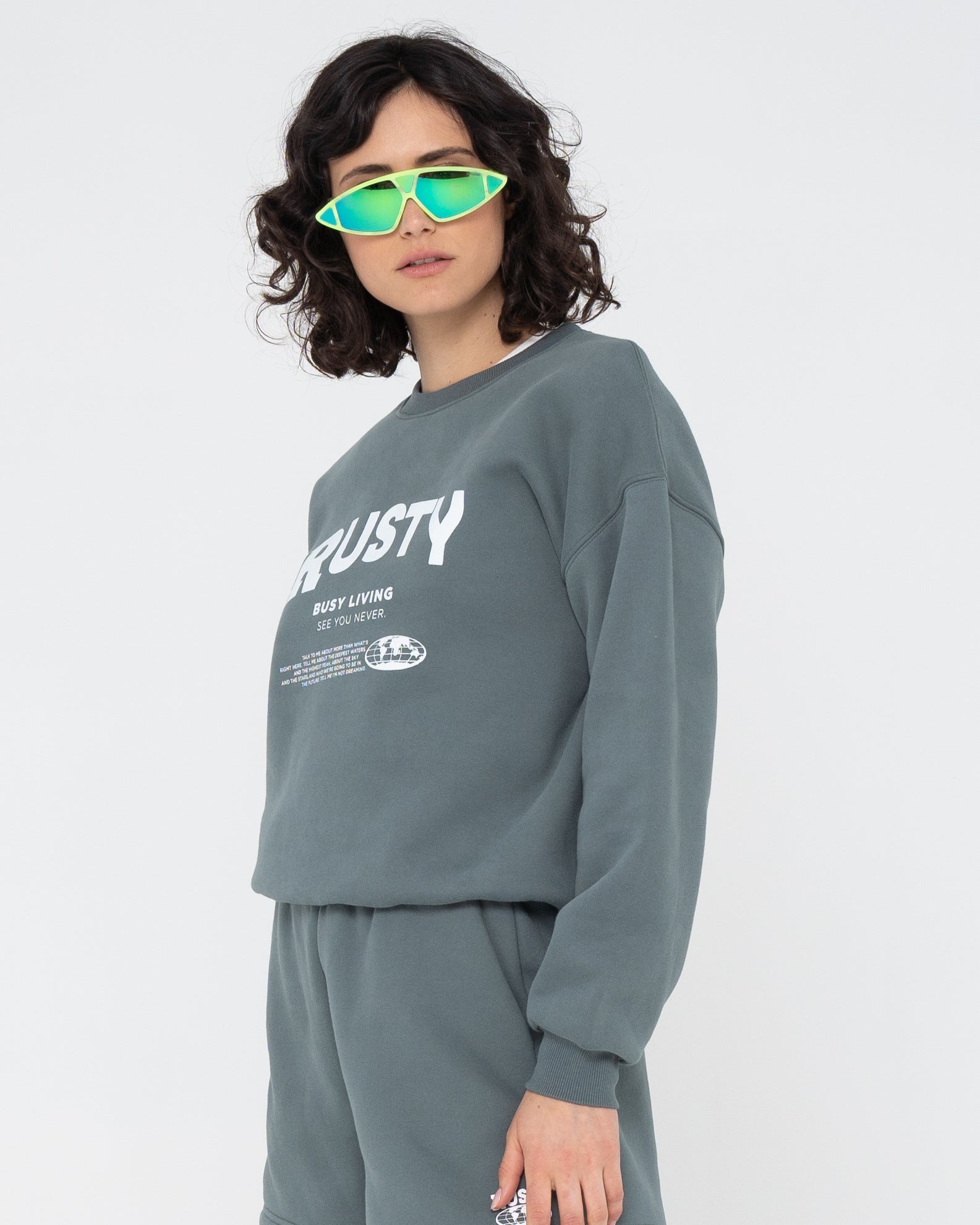 Relaxed fit crew neck fleece with a round neckline, dropped shoulders and a front print.