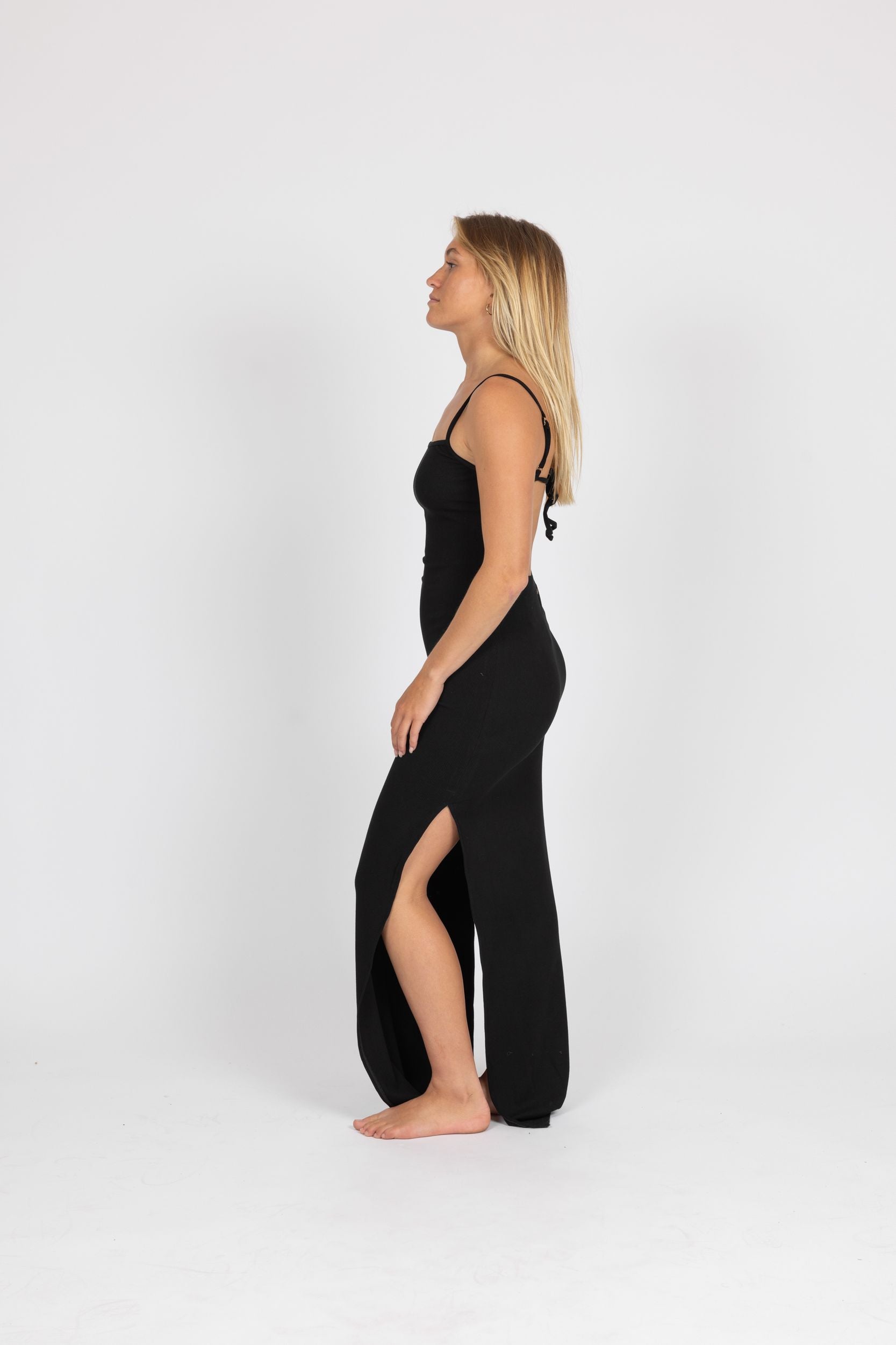 Slim fit rib knit dress with adjustable spaghetti straps and back closure. Material: 95 % cotton / 5 % elastane
