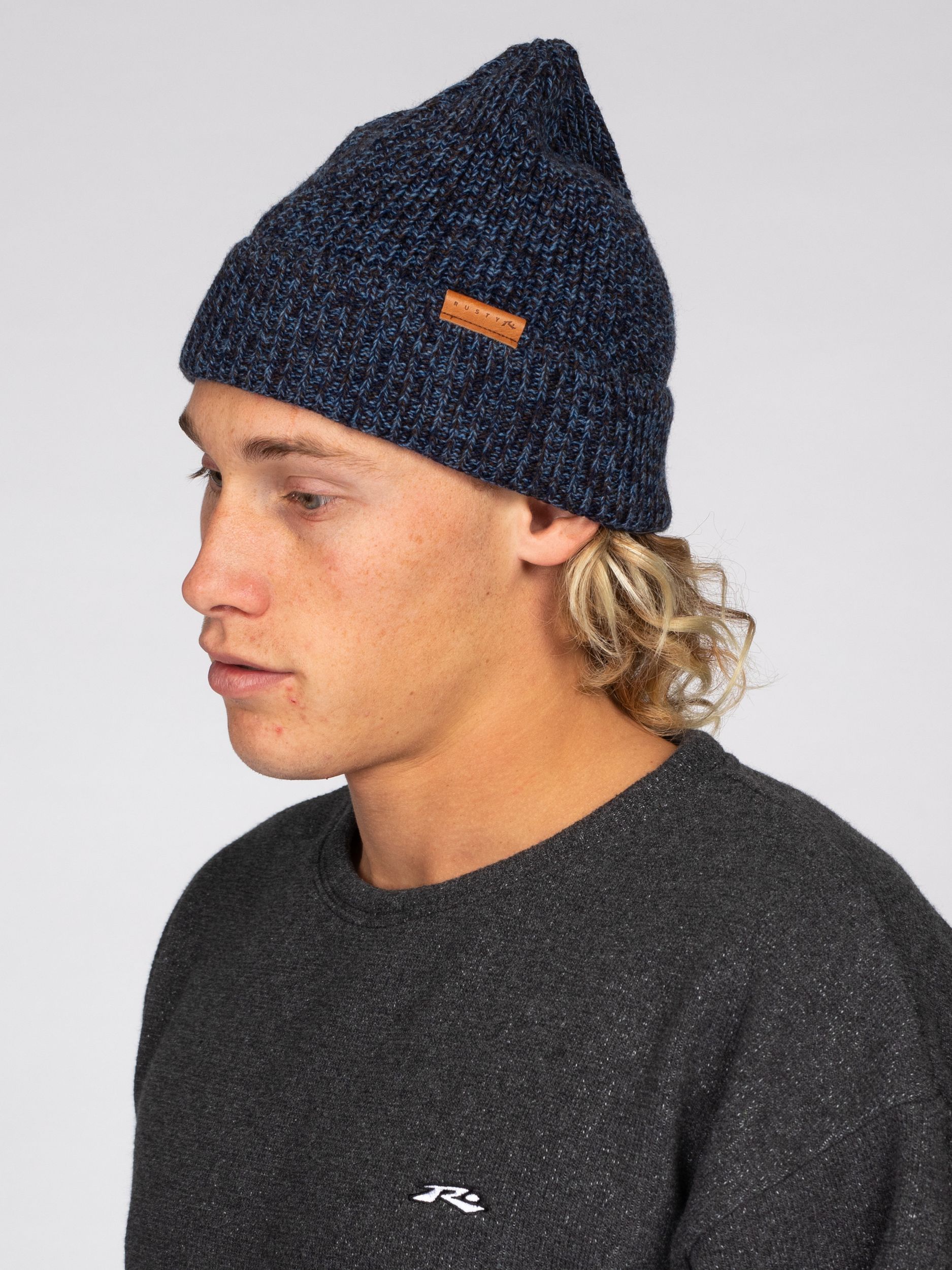 Knitted hat with lapel and rusty leather patch. Material: Soft acrylic
