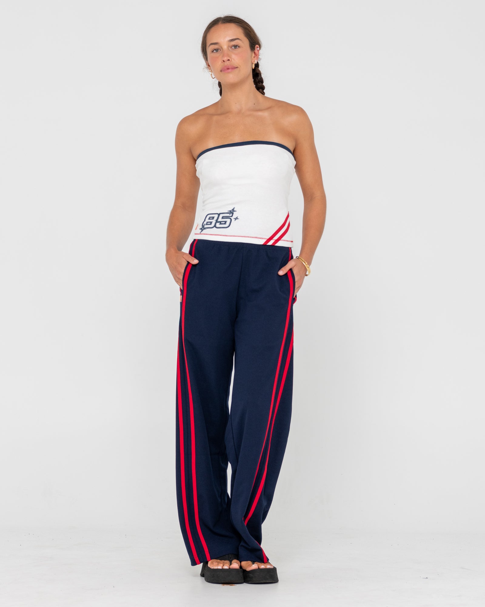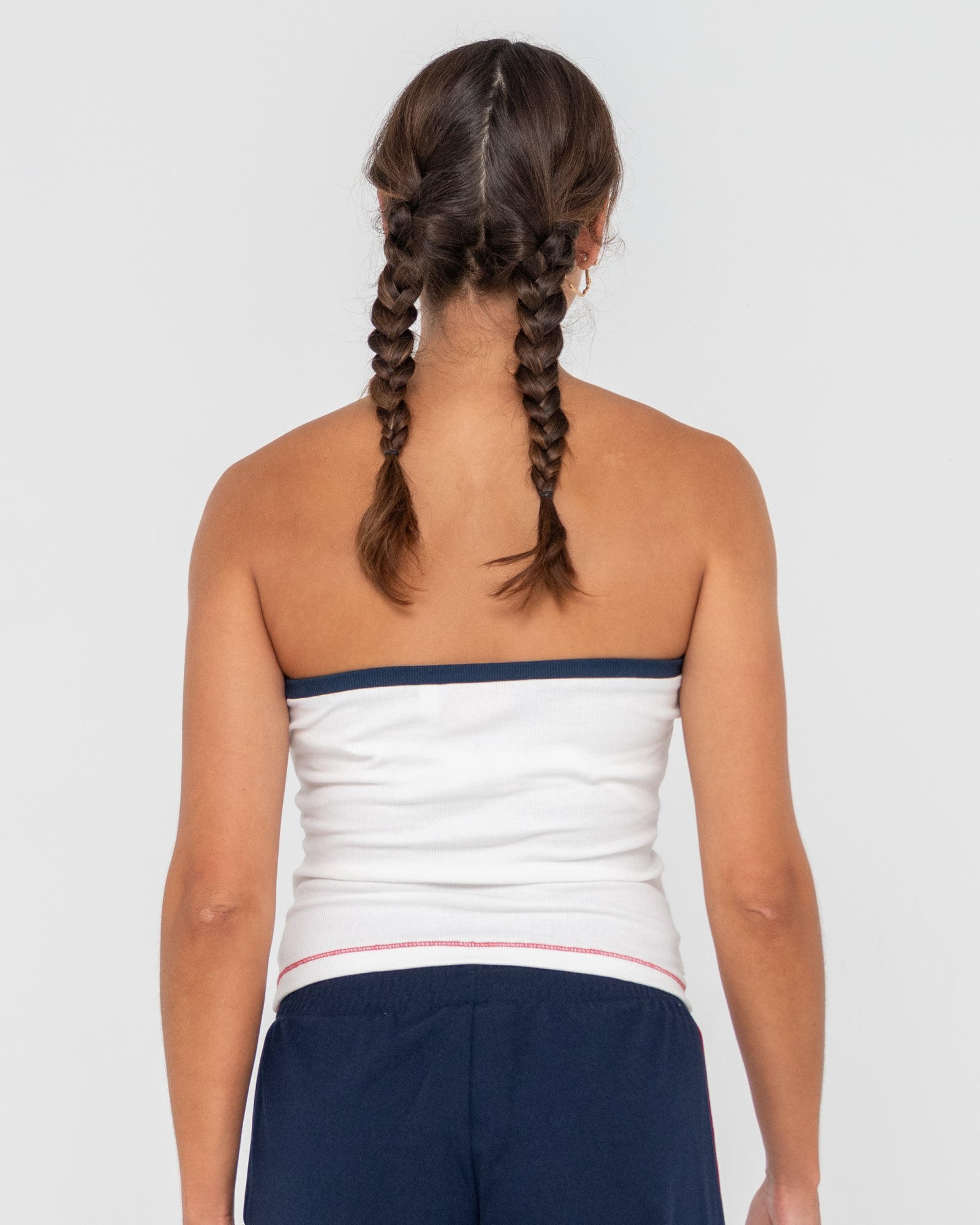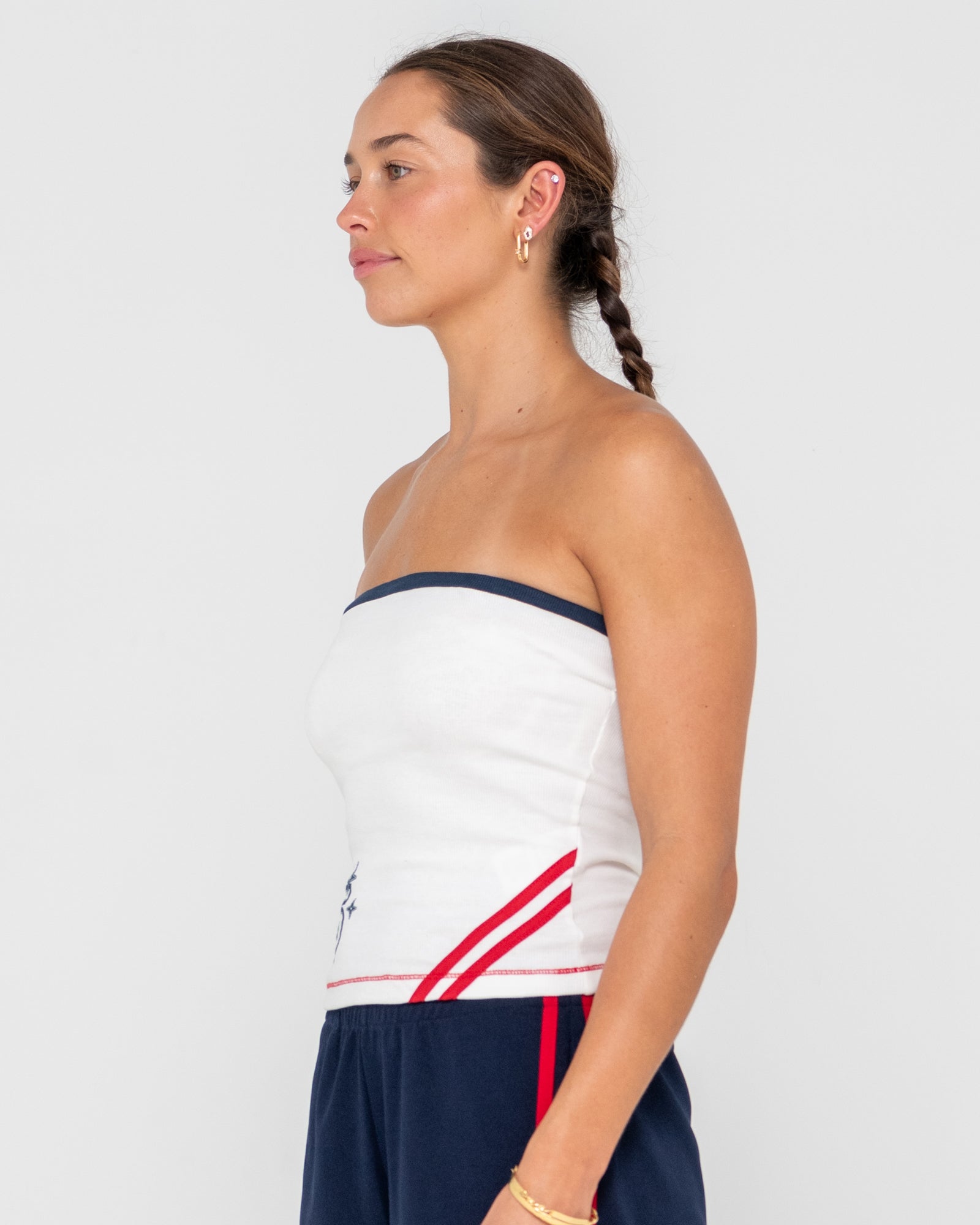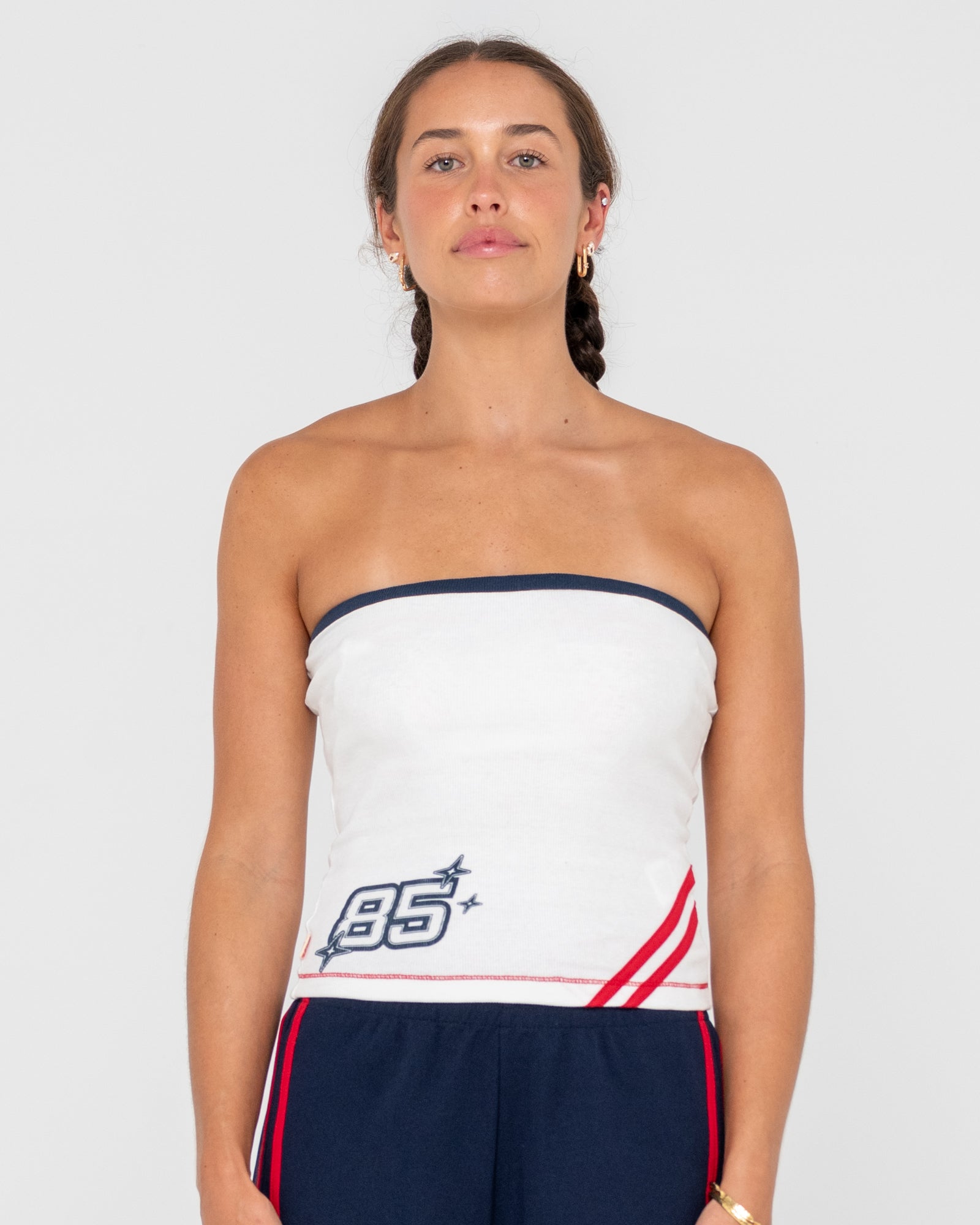 Strapless, slim-fit, ribbed top in skimmer length with stripe detail and graphic on the front. Material: 70% viscose / 30% nylon
