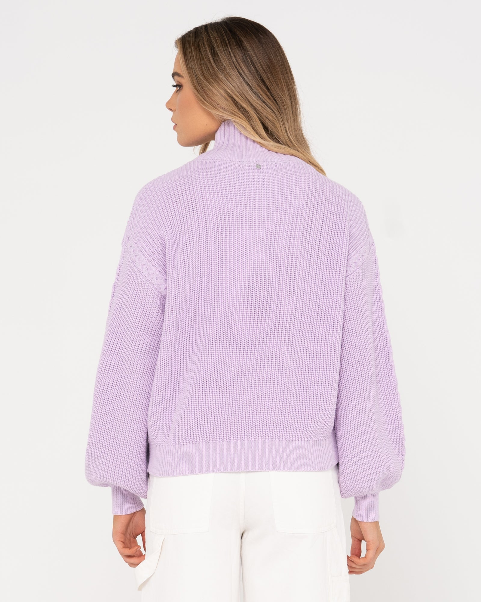 Oversized knitted sweater with a high collar, fixed waist and ¼ zipper. Material: cotton