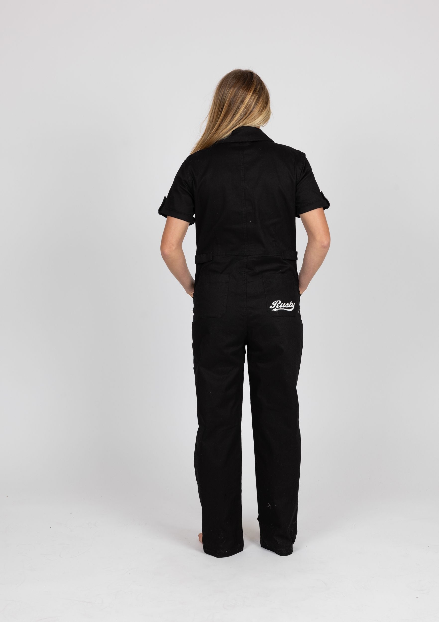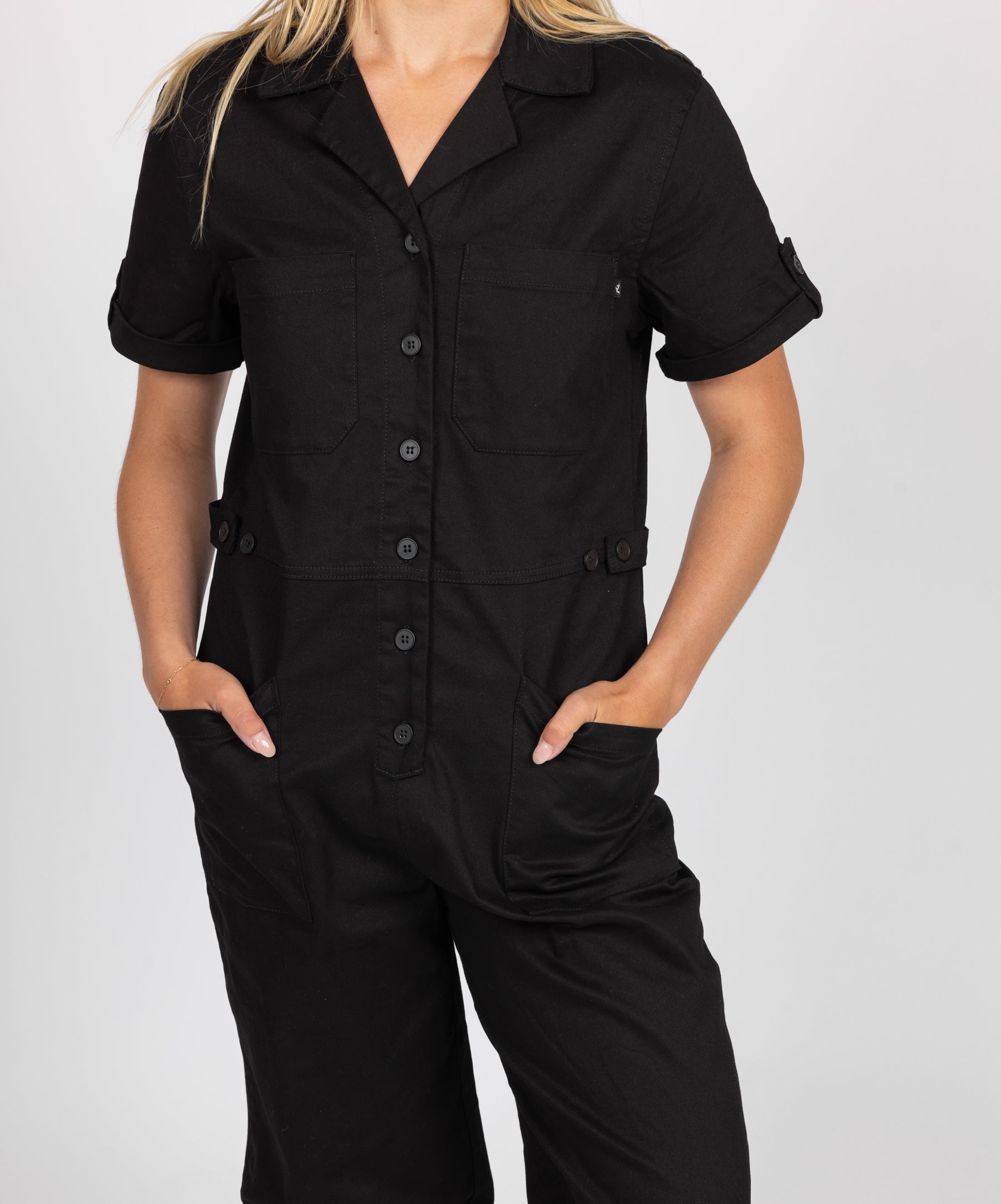 Cotton spandex overall with adjustable waist and rolled sleeves. Materials: 97 % cotton / 3 % spandex