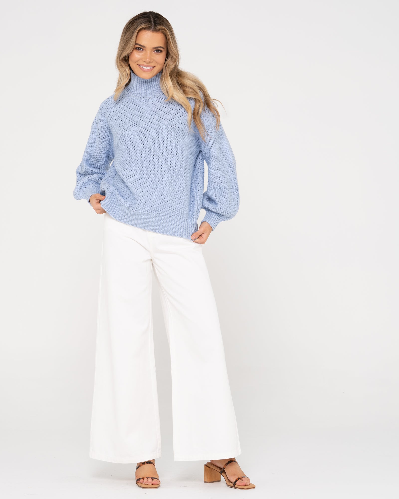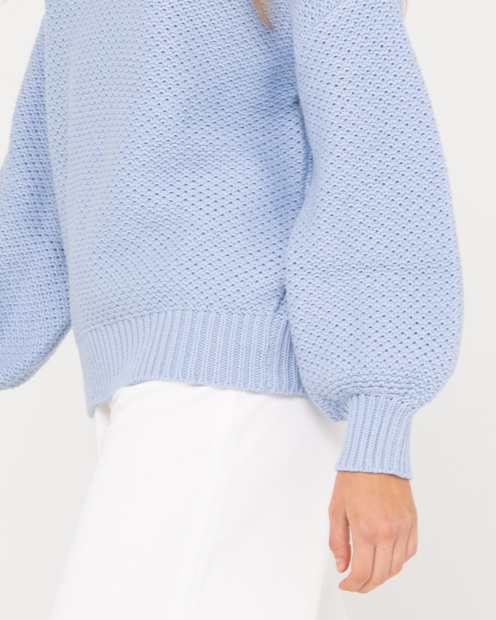 Comfortable knitted sweater with a high-cut round neckline and balloon sleeves. Material: cotton-acrylic yarn