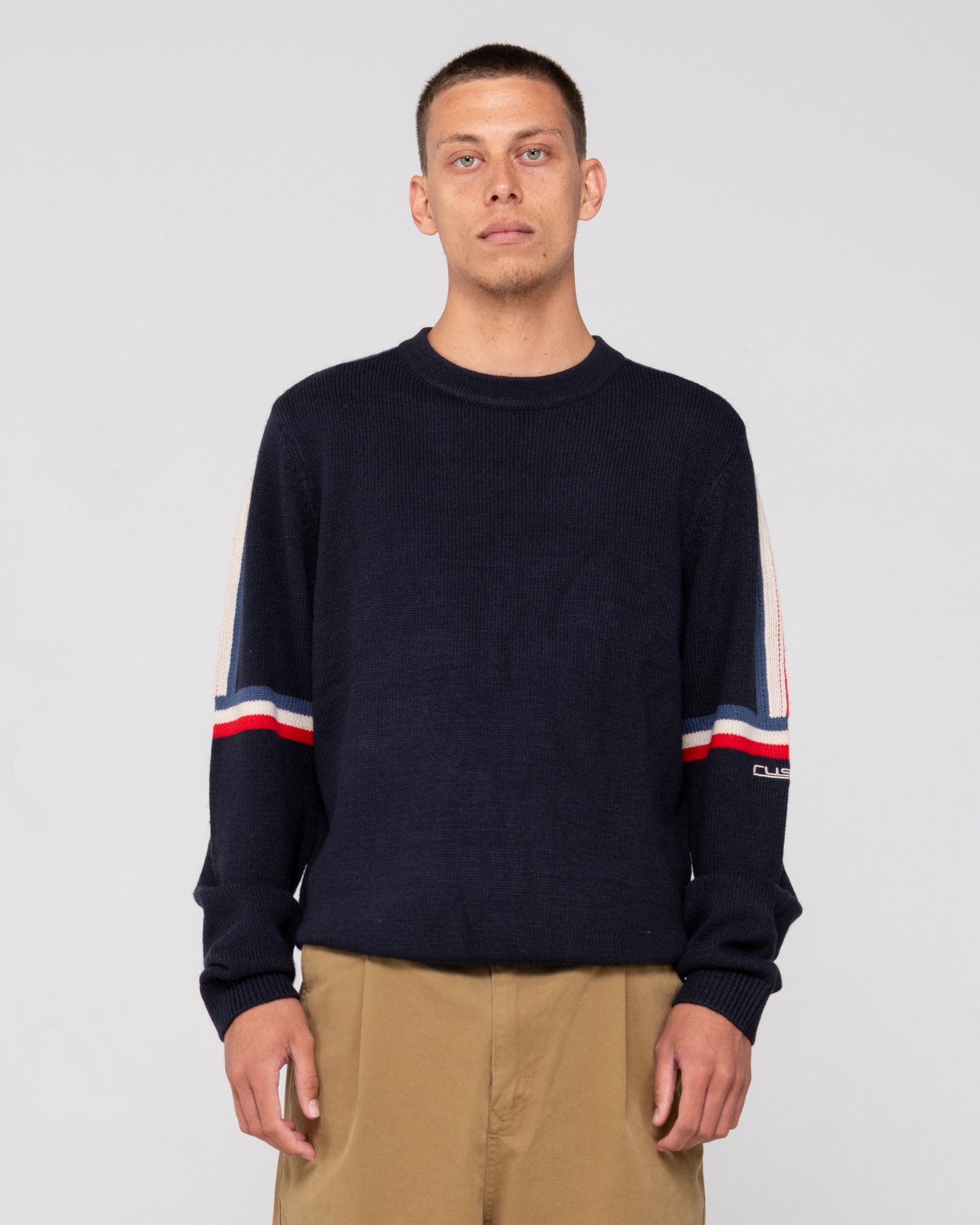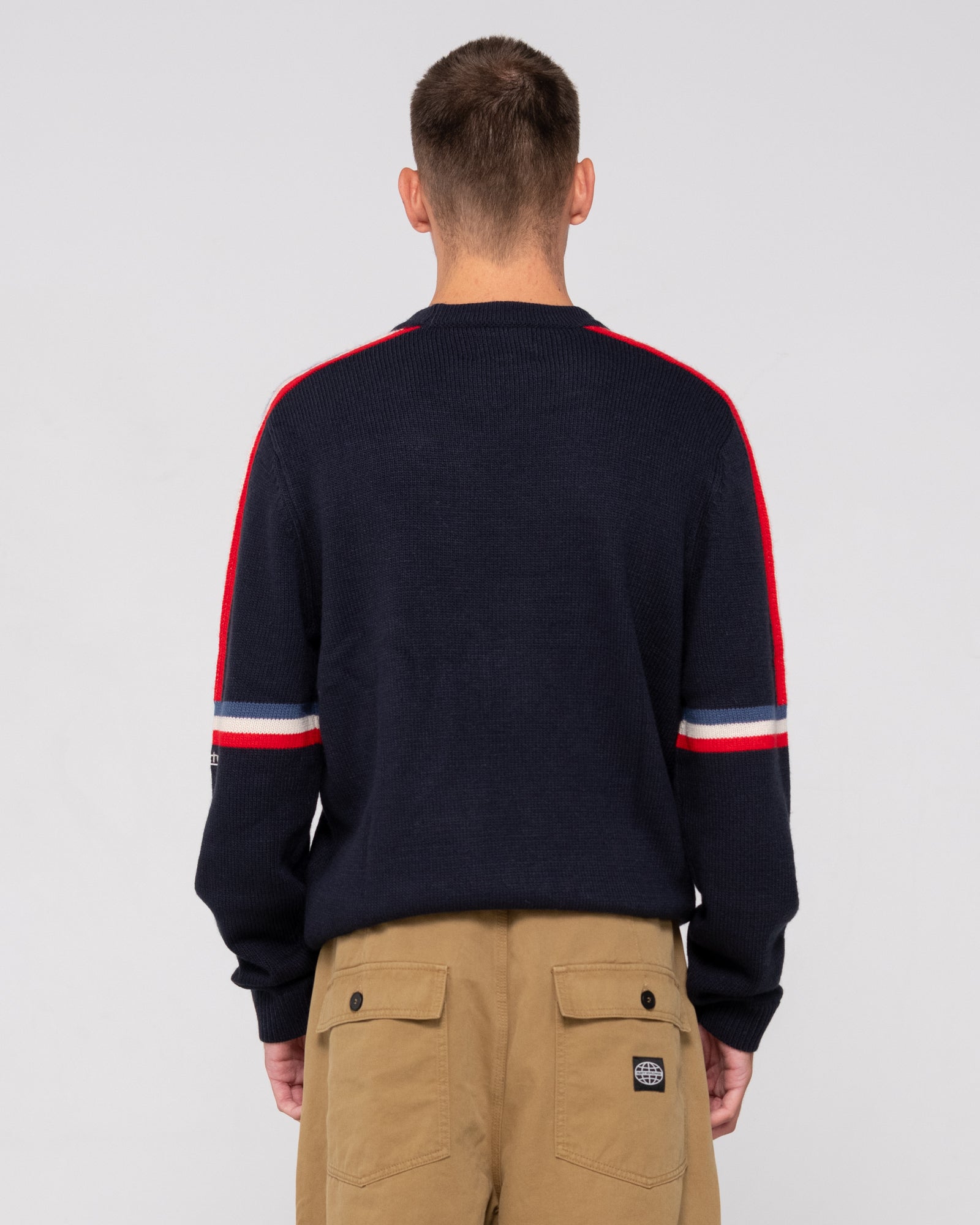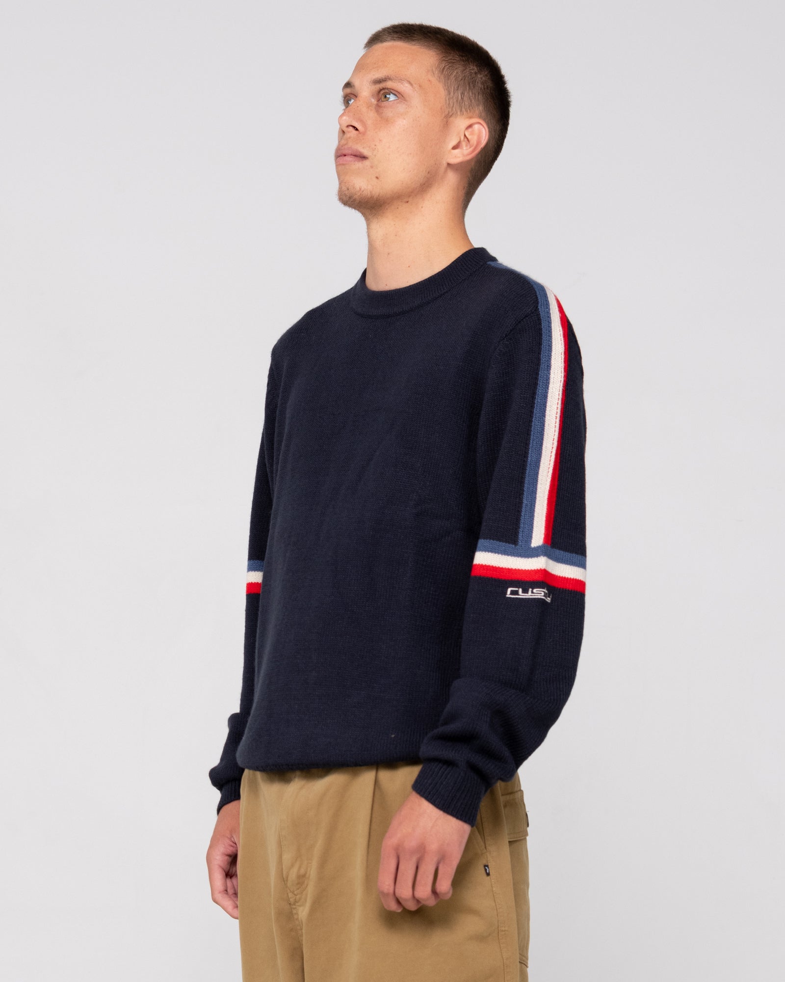 Standard fit crew neck with retro stripe detail and rusty embroidery. Material: 100% acrylic knit