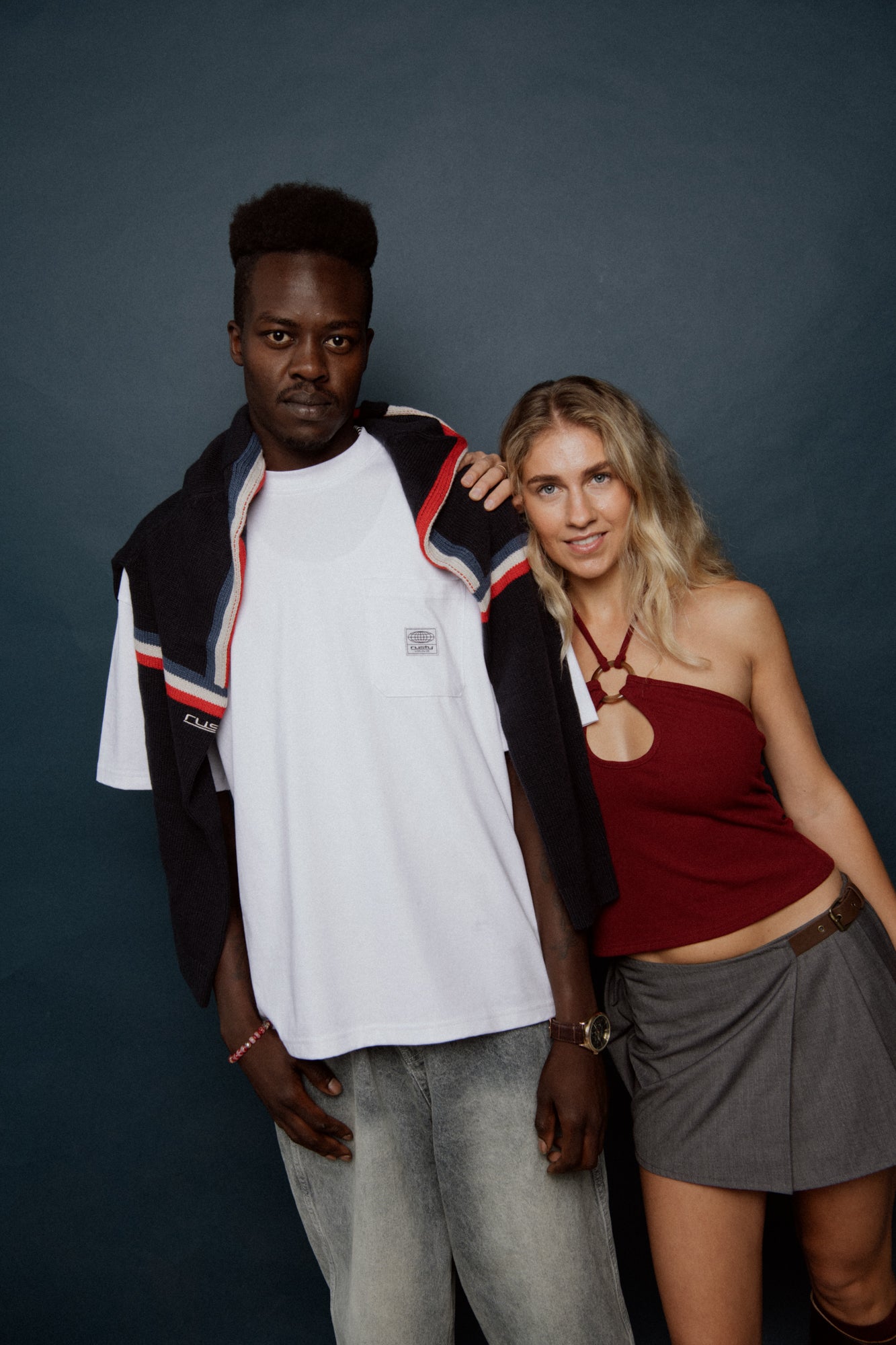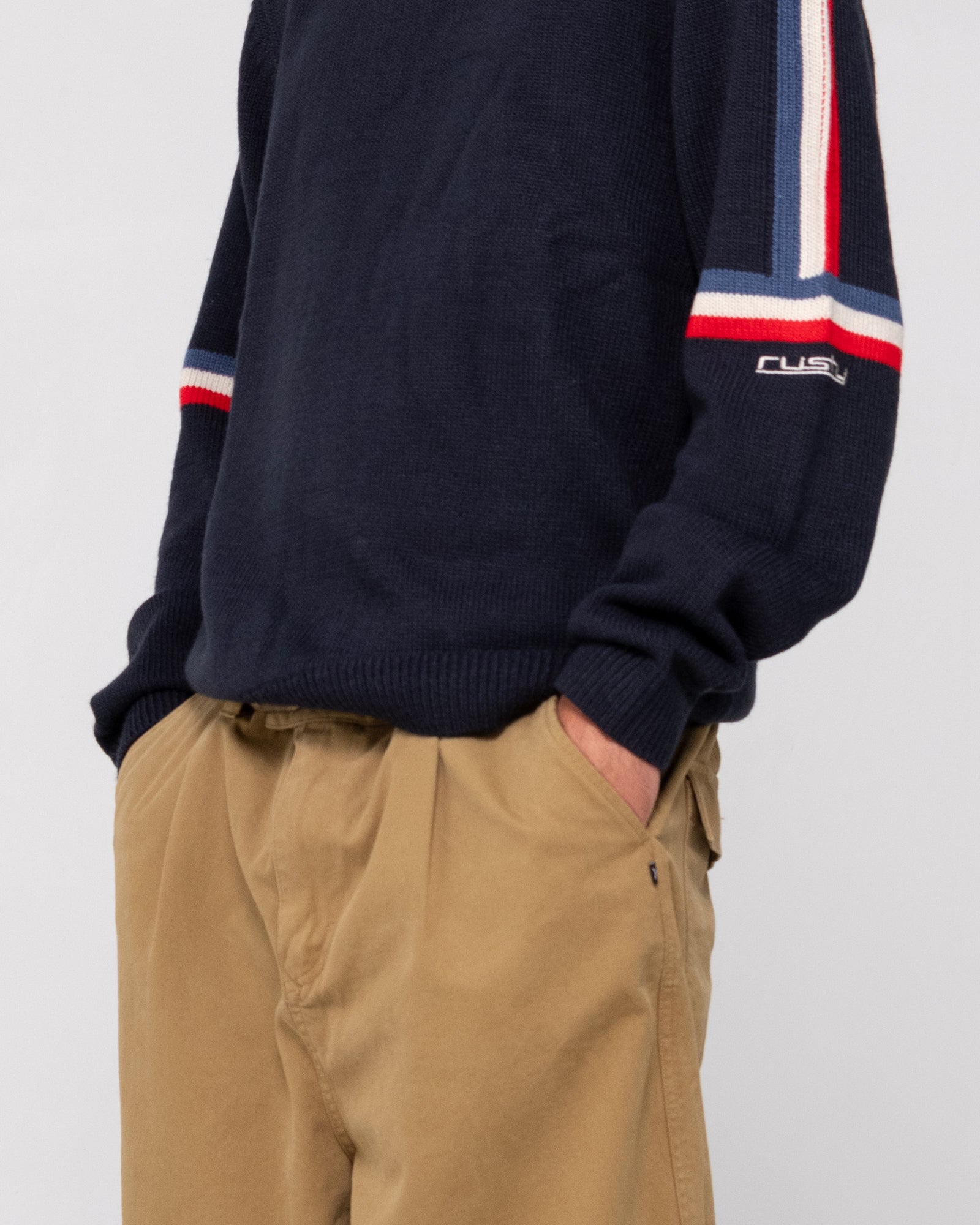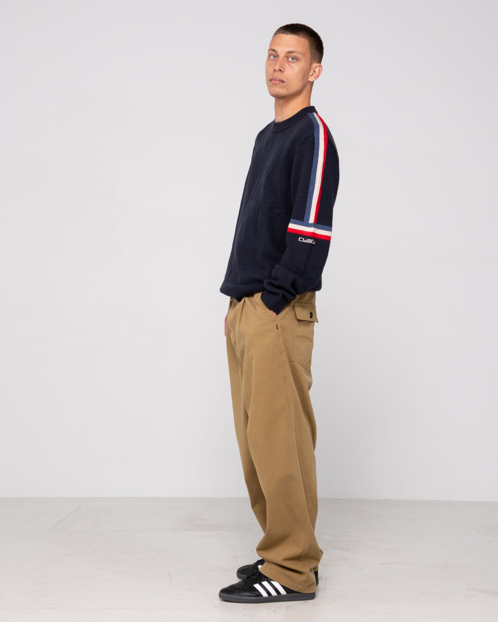 Standard fit crew neck with retro stripe detail and rusty embroidery. Material: 100% acrylic knit