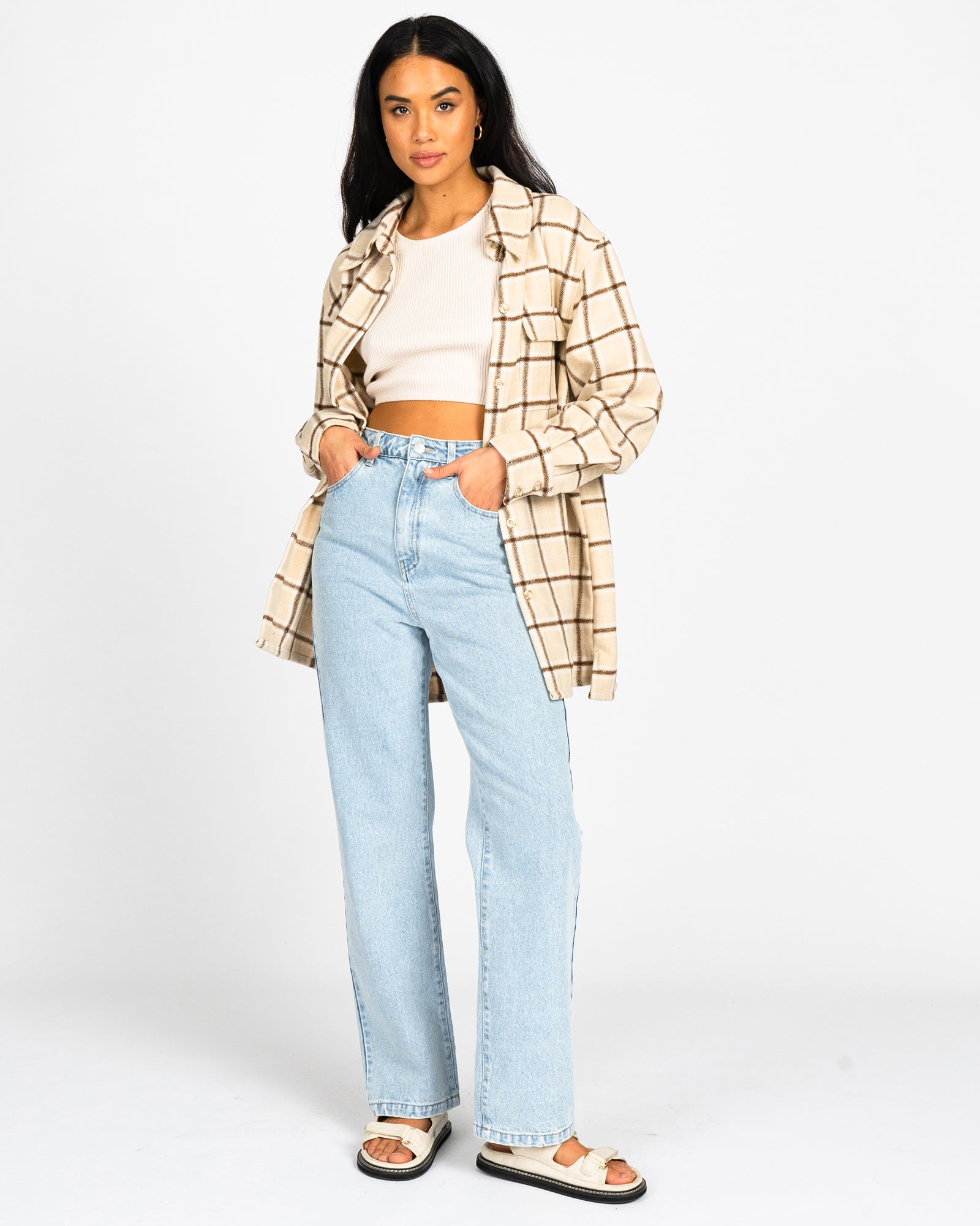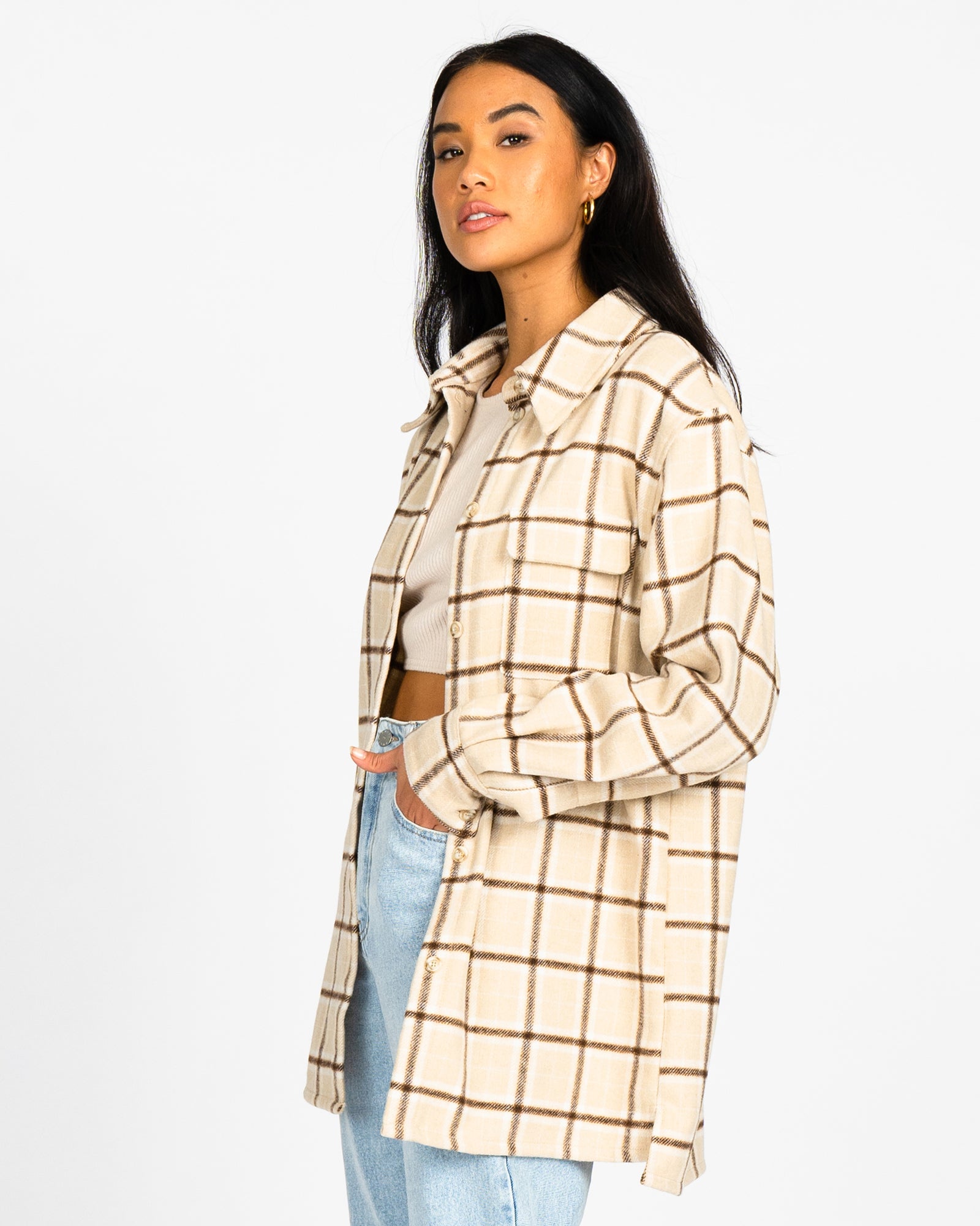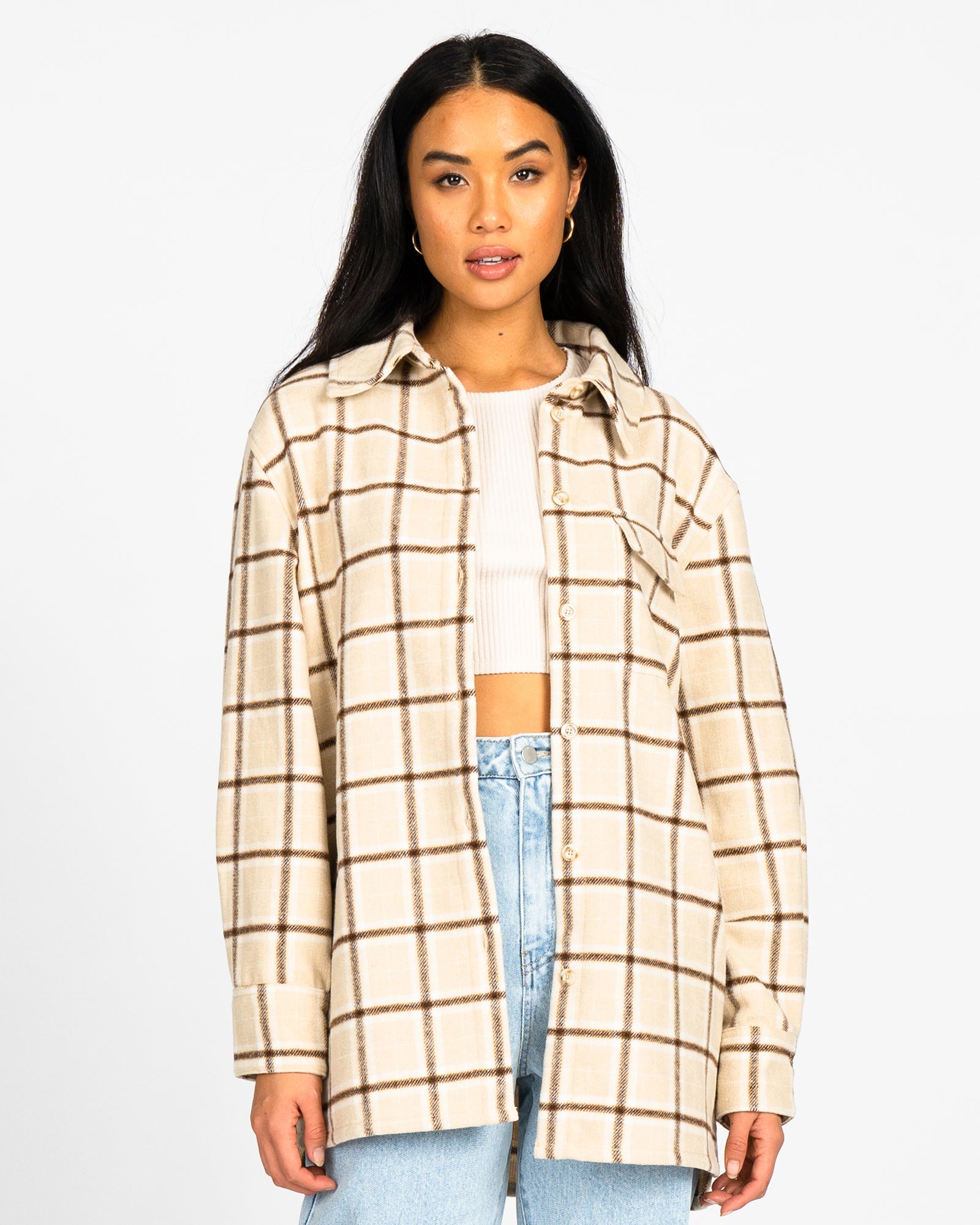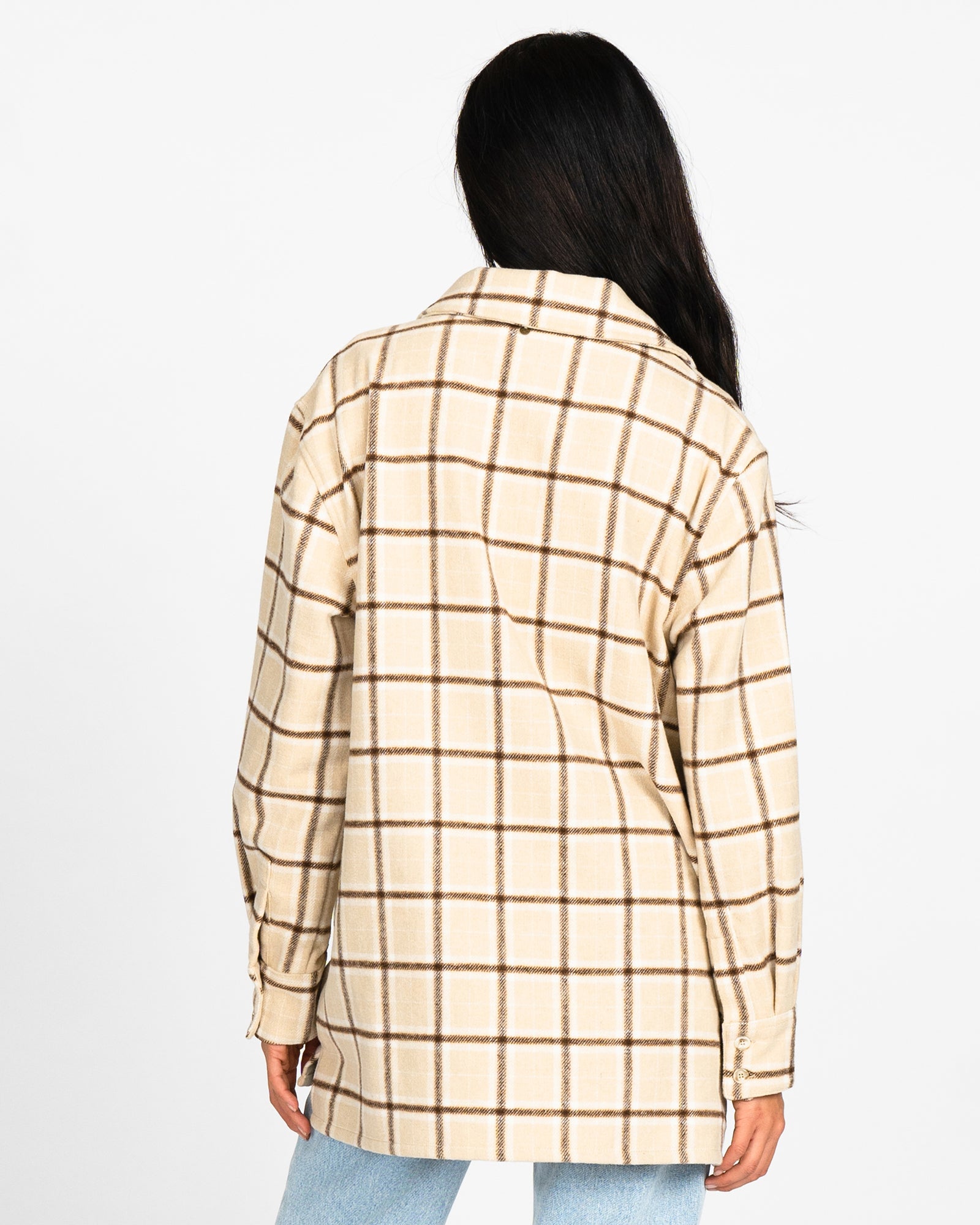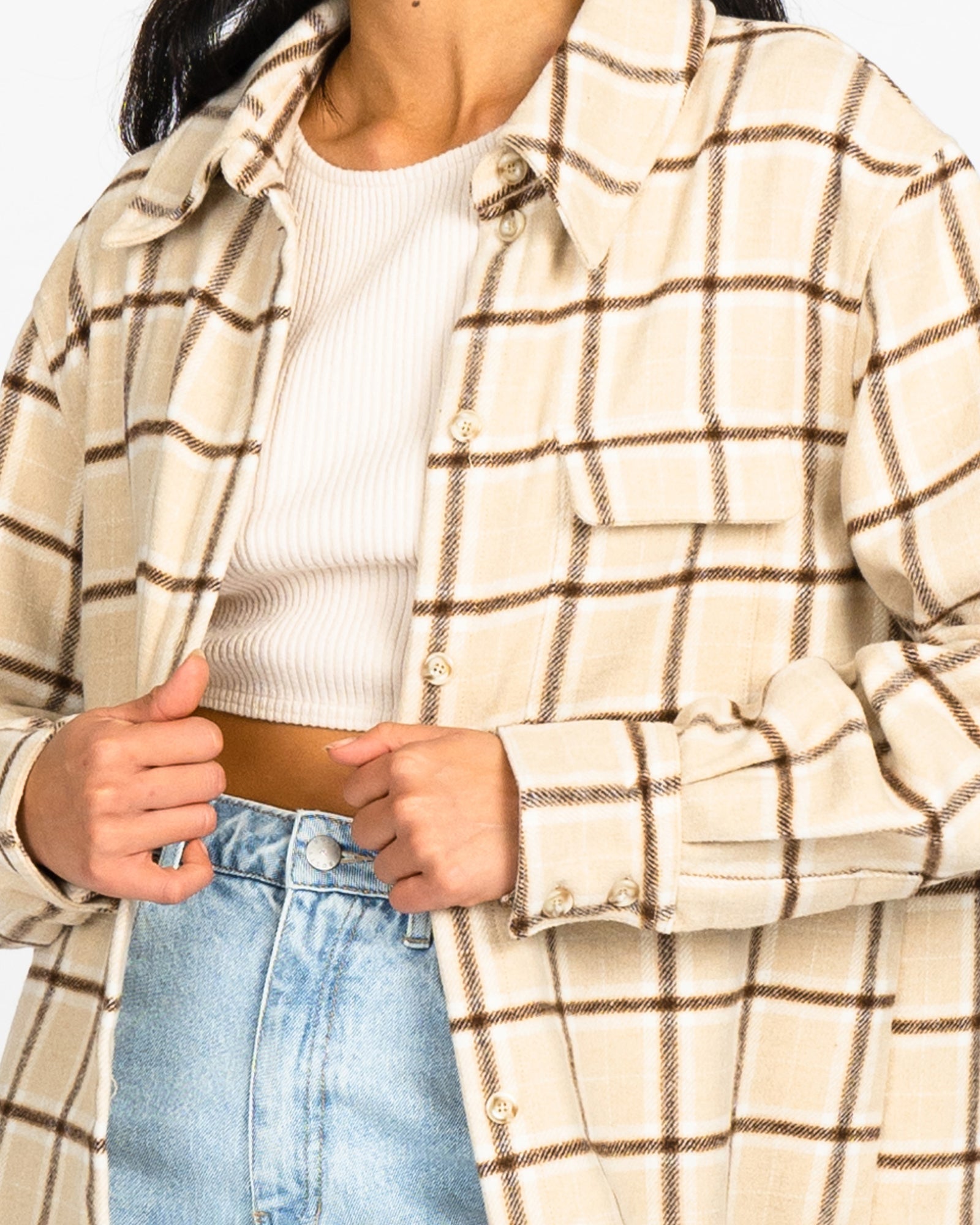 long-sleeved oversized shirt with pocket and rusty details, checked. Material: blend of wool and polyester, checked