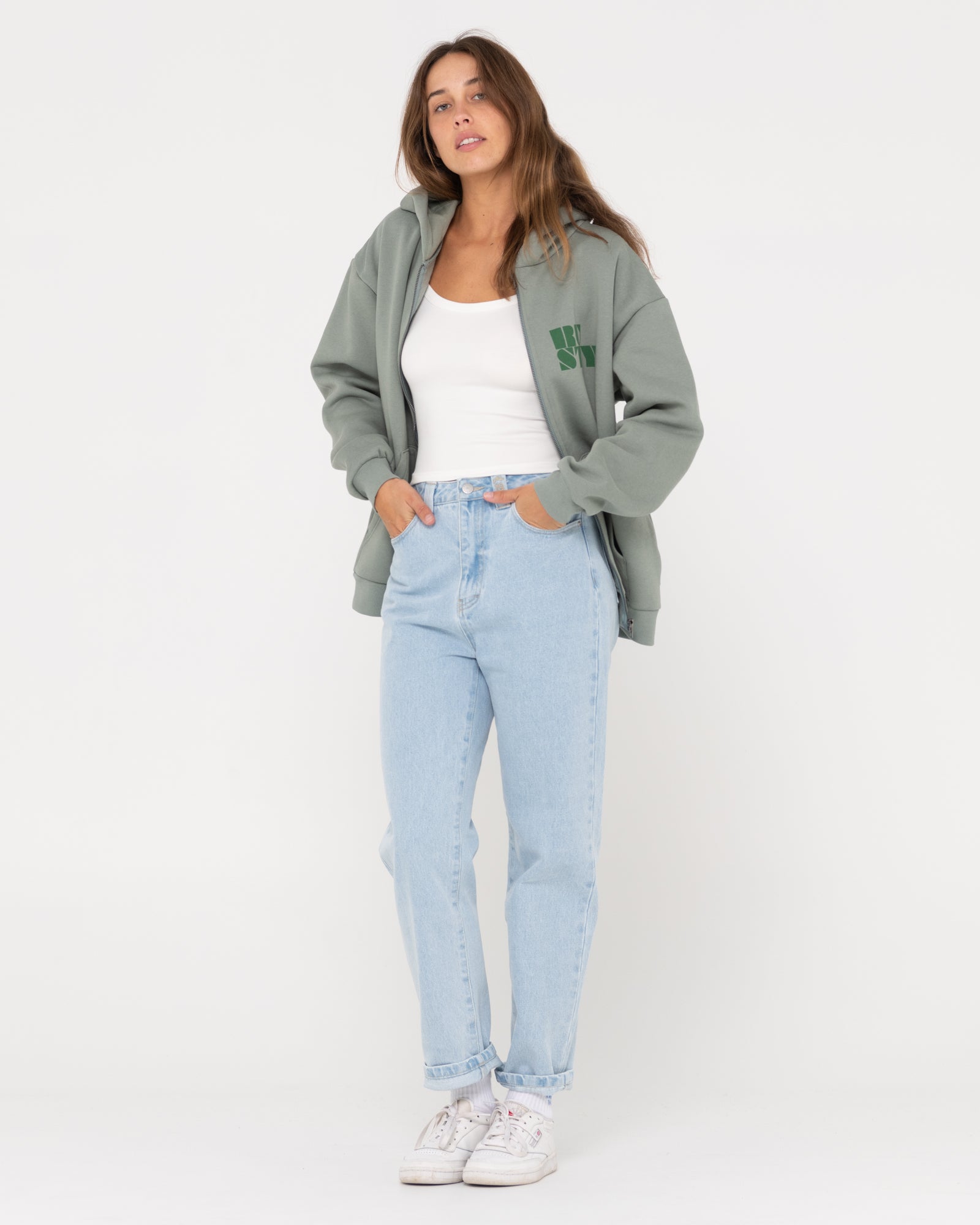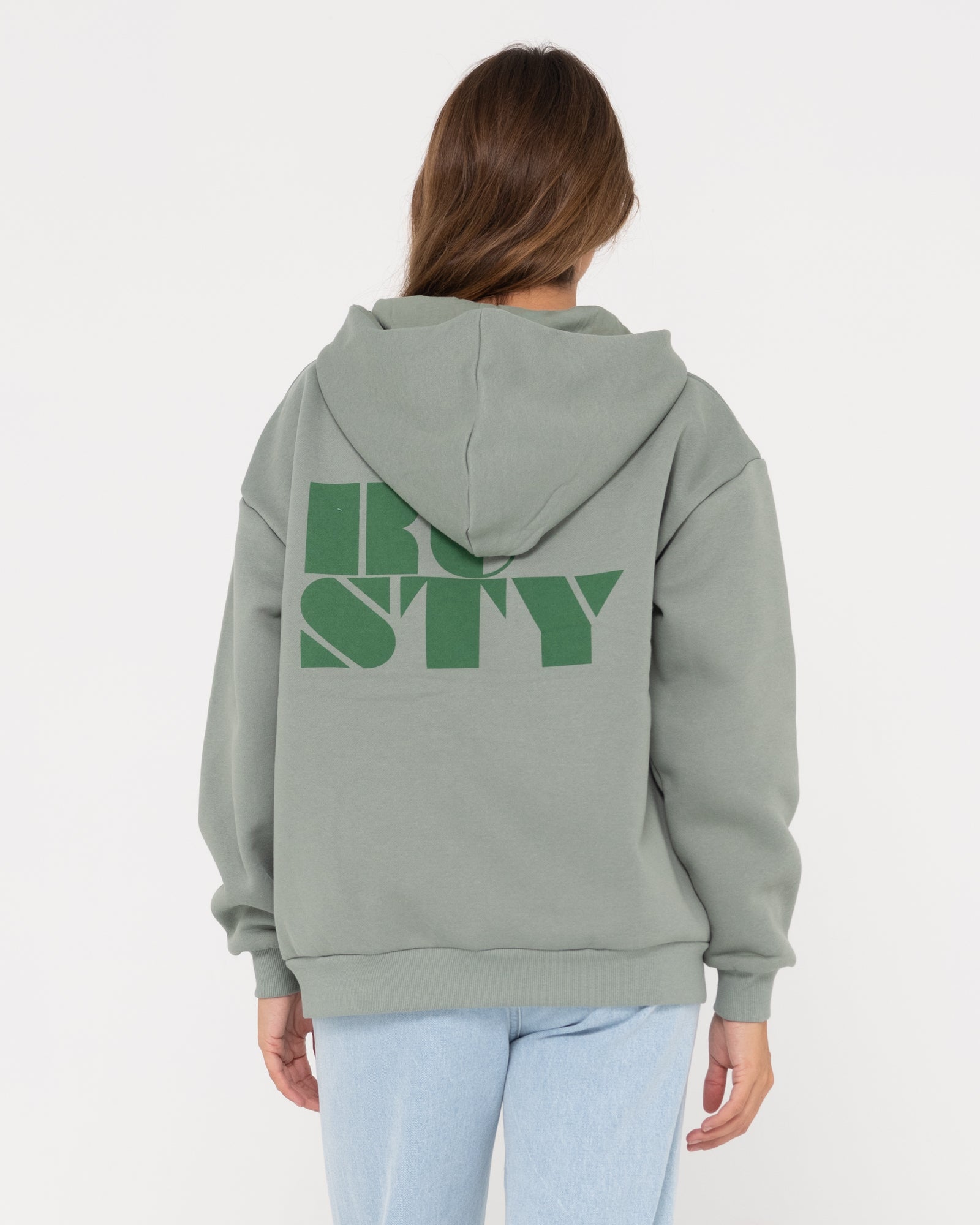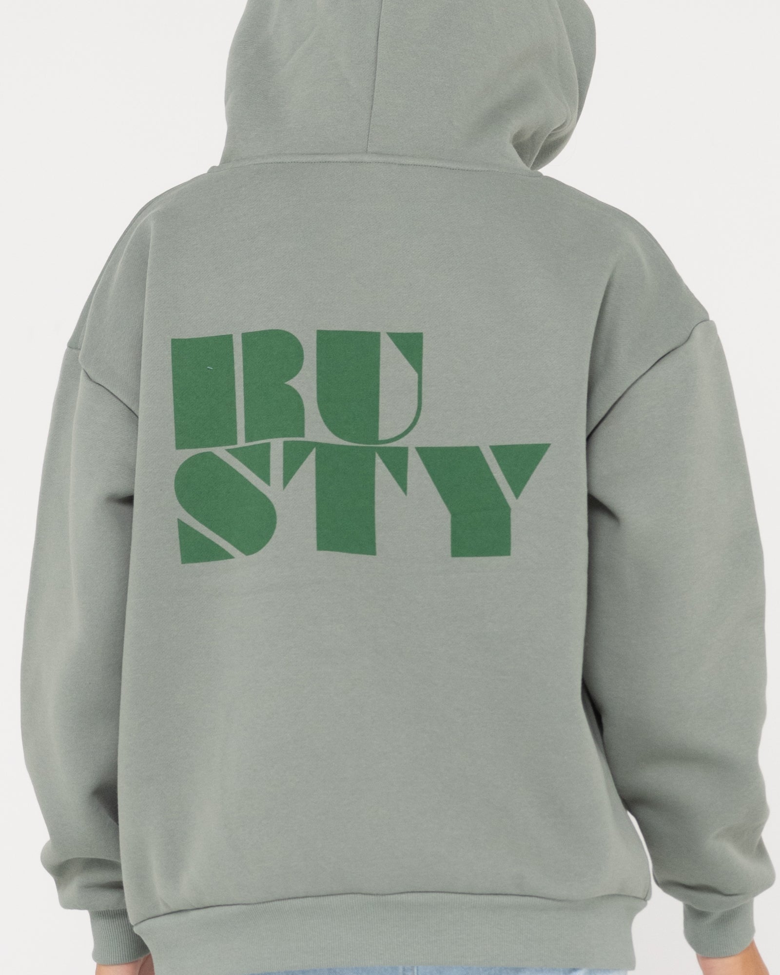 Oversized hooded fleece with zipper and Rusty print on the front and back. Material: 80% cotton 20% polyester brushed fleece