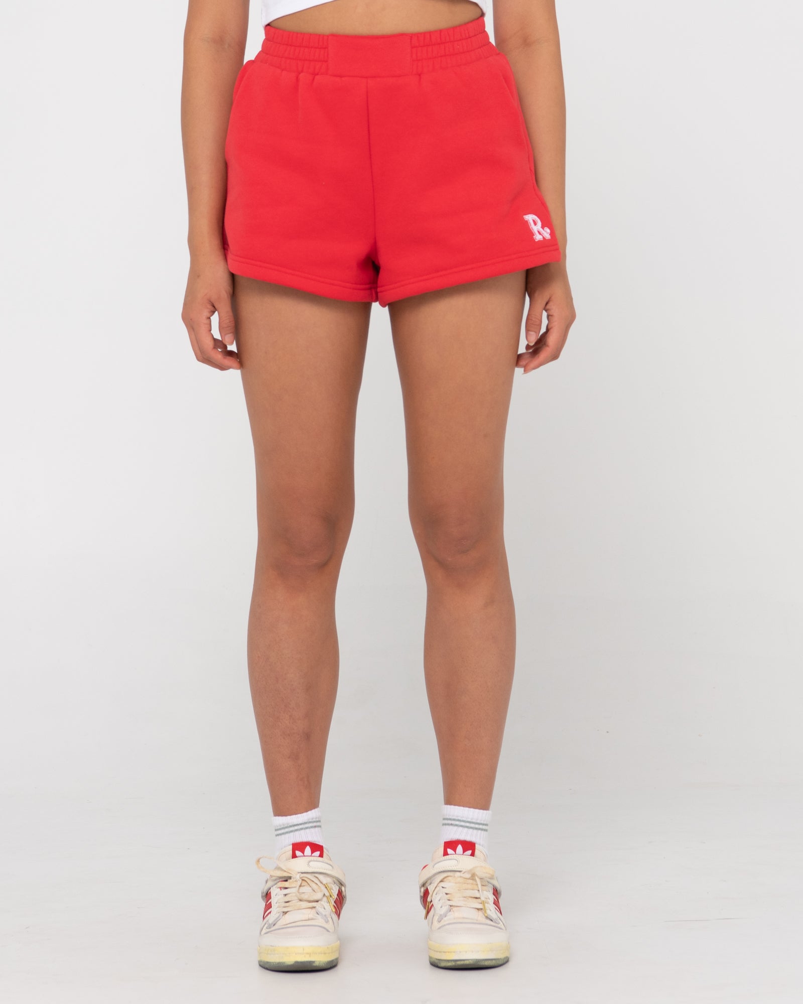 Rusty relaxed fit lounge shorts with patch front pockets and elastic waistband.