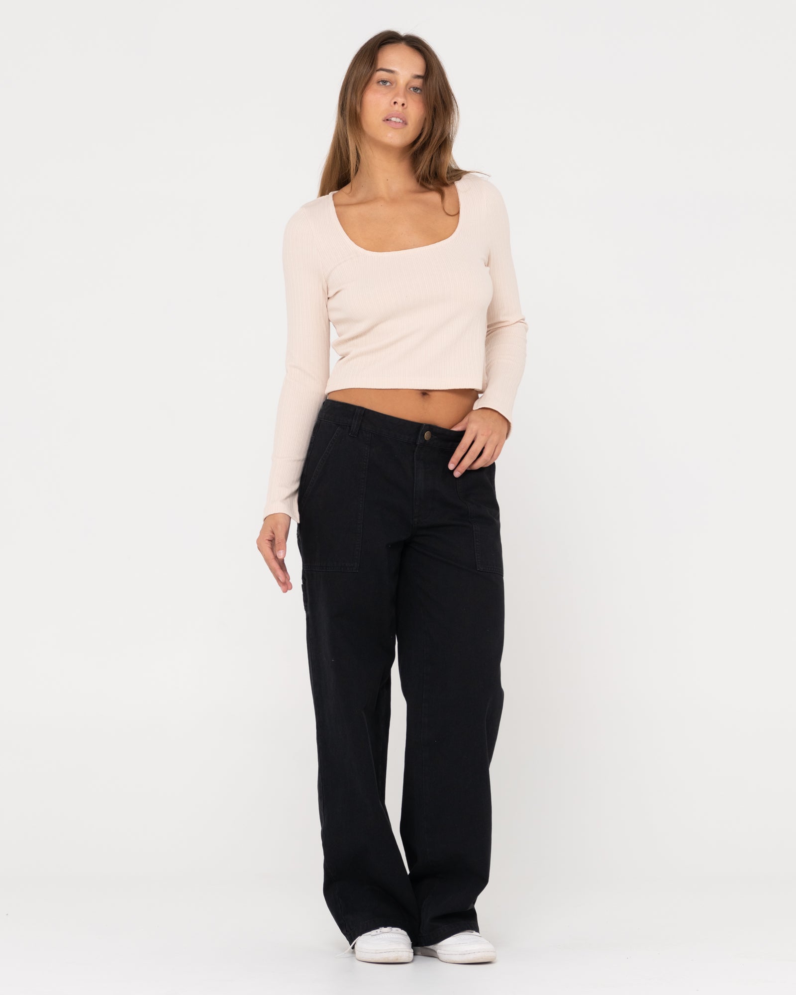 Long-sleeved, ribbed top with a deep round neckline and slit sleeves. Material: 100% ribbed cotton jersey