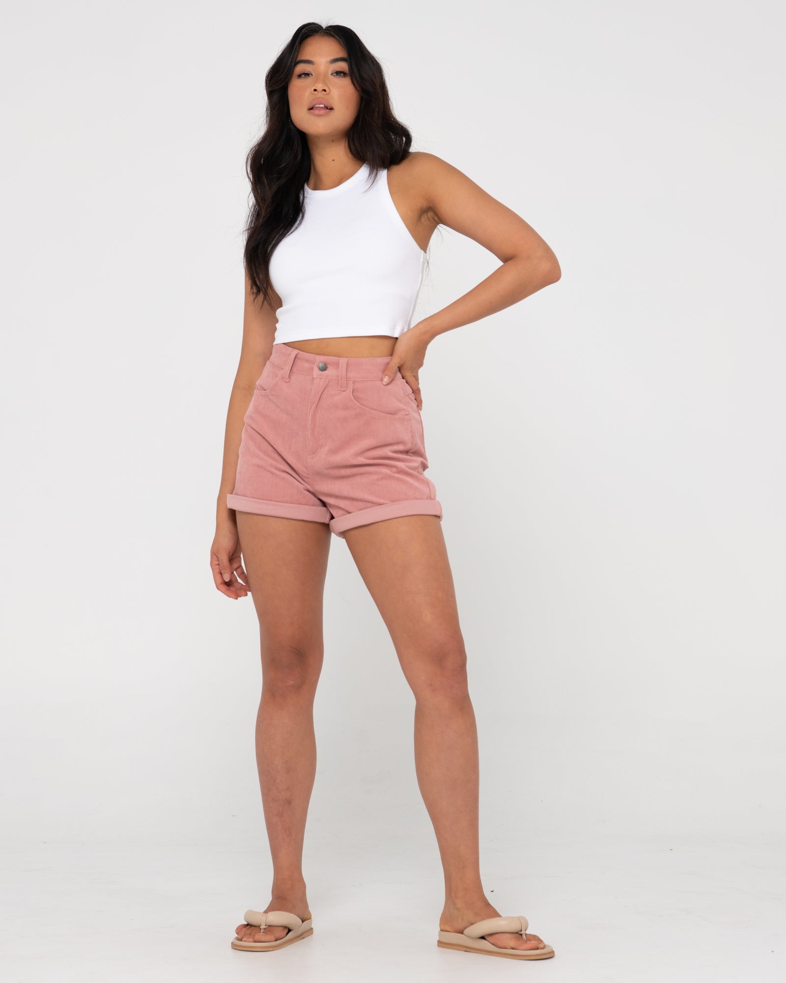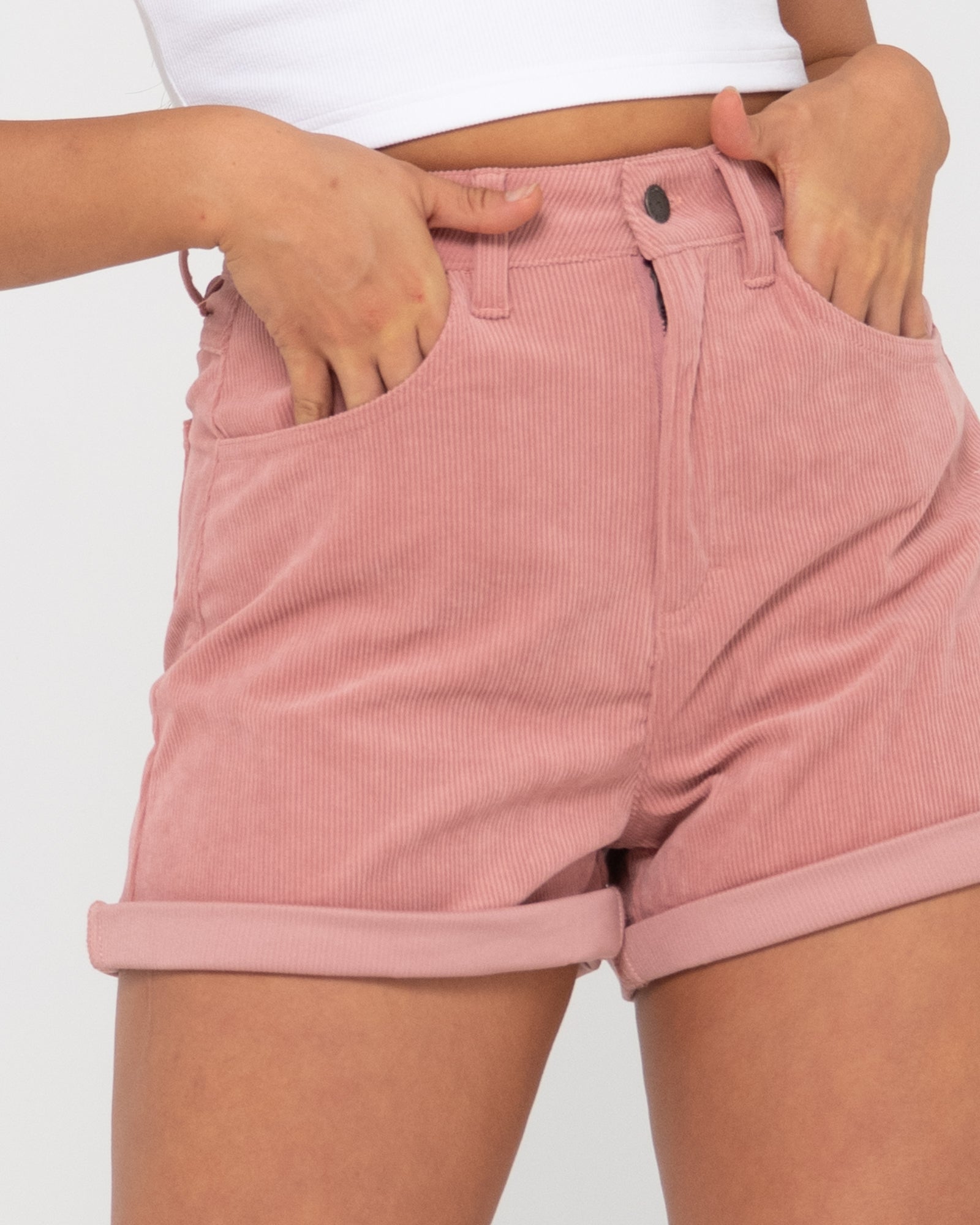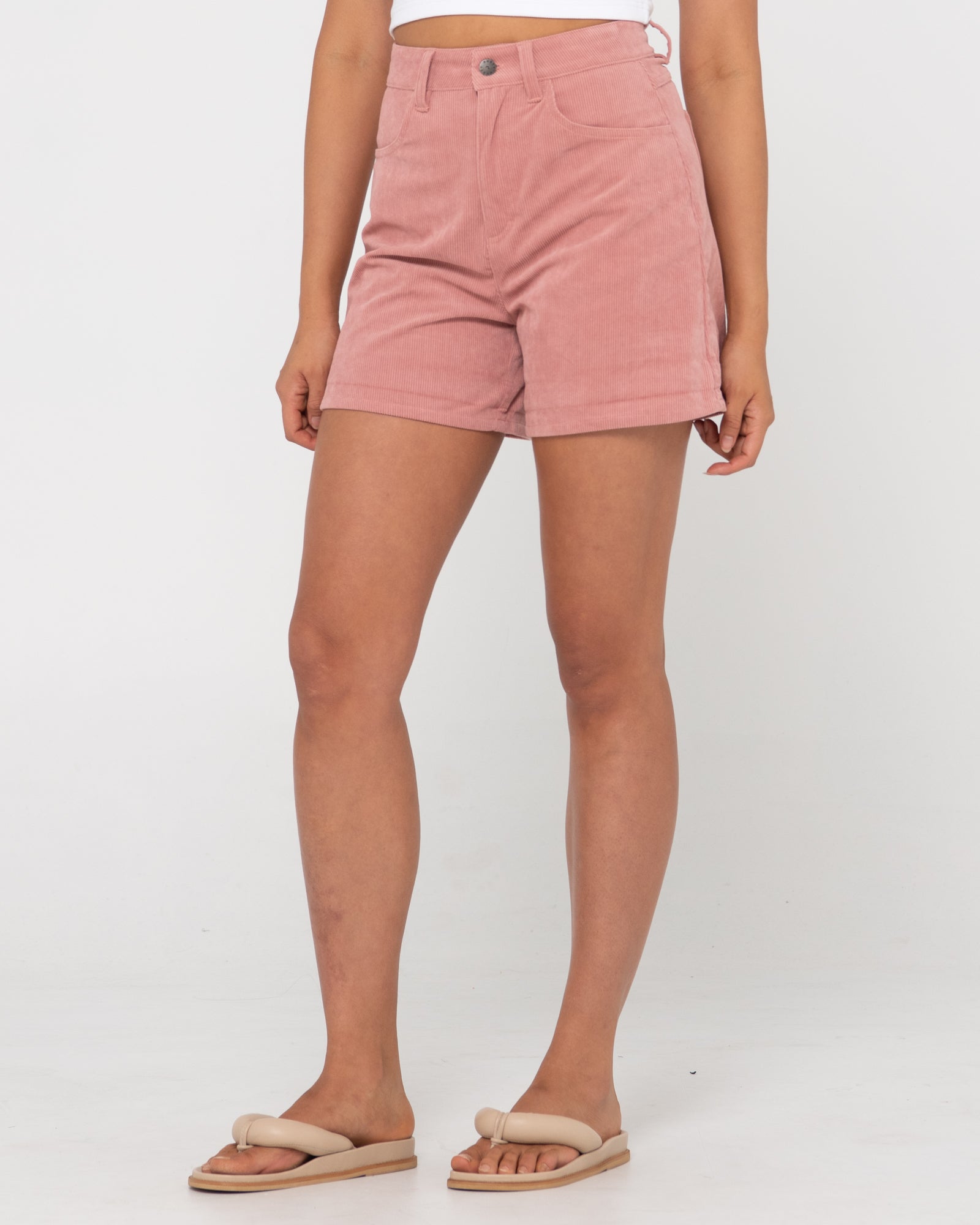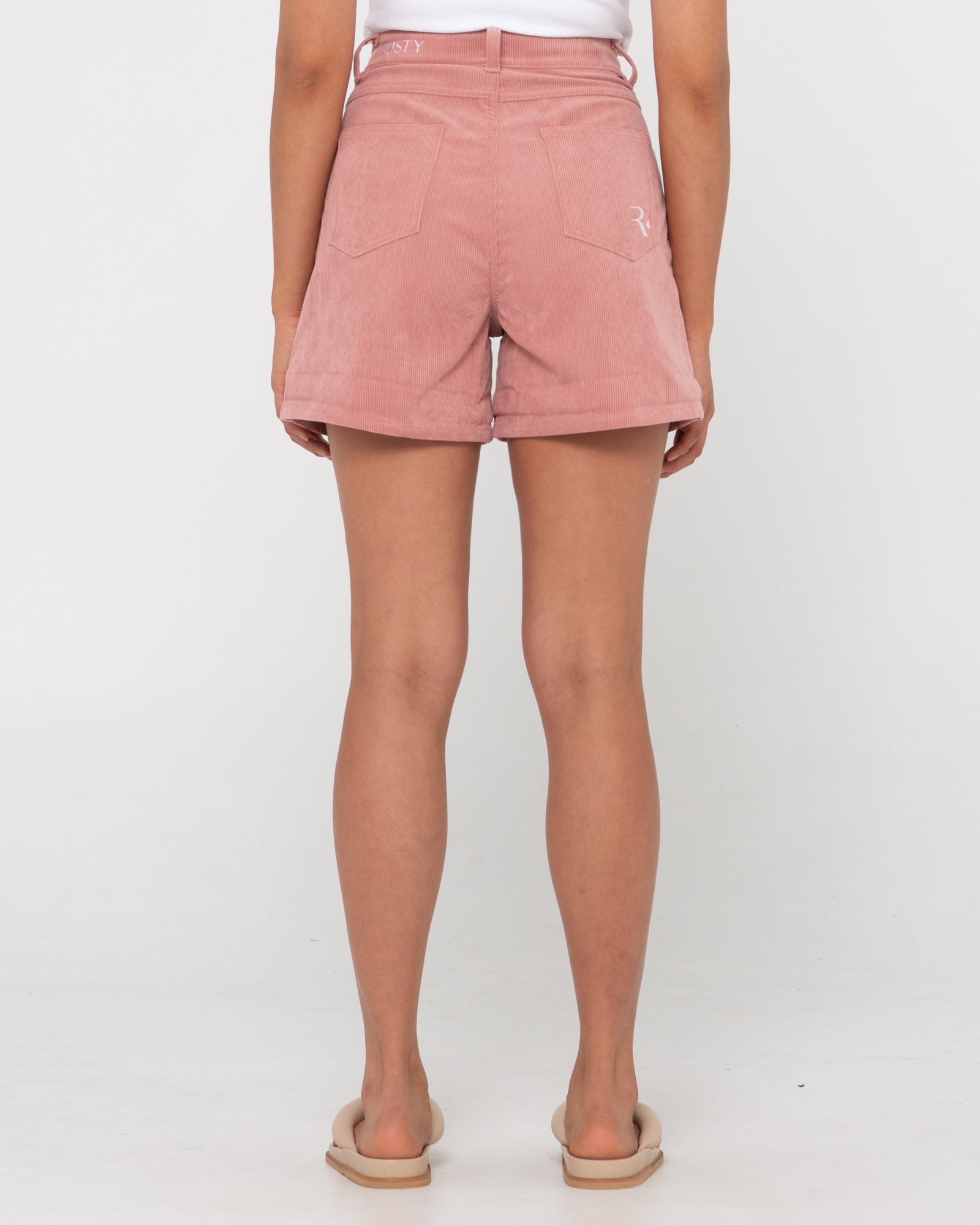Rusty relaxed fit lounge shorts with patch front pockets and elastic waistband.