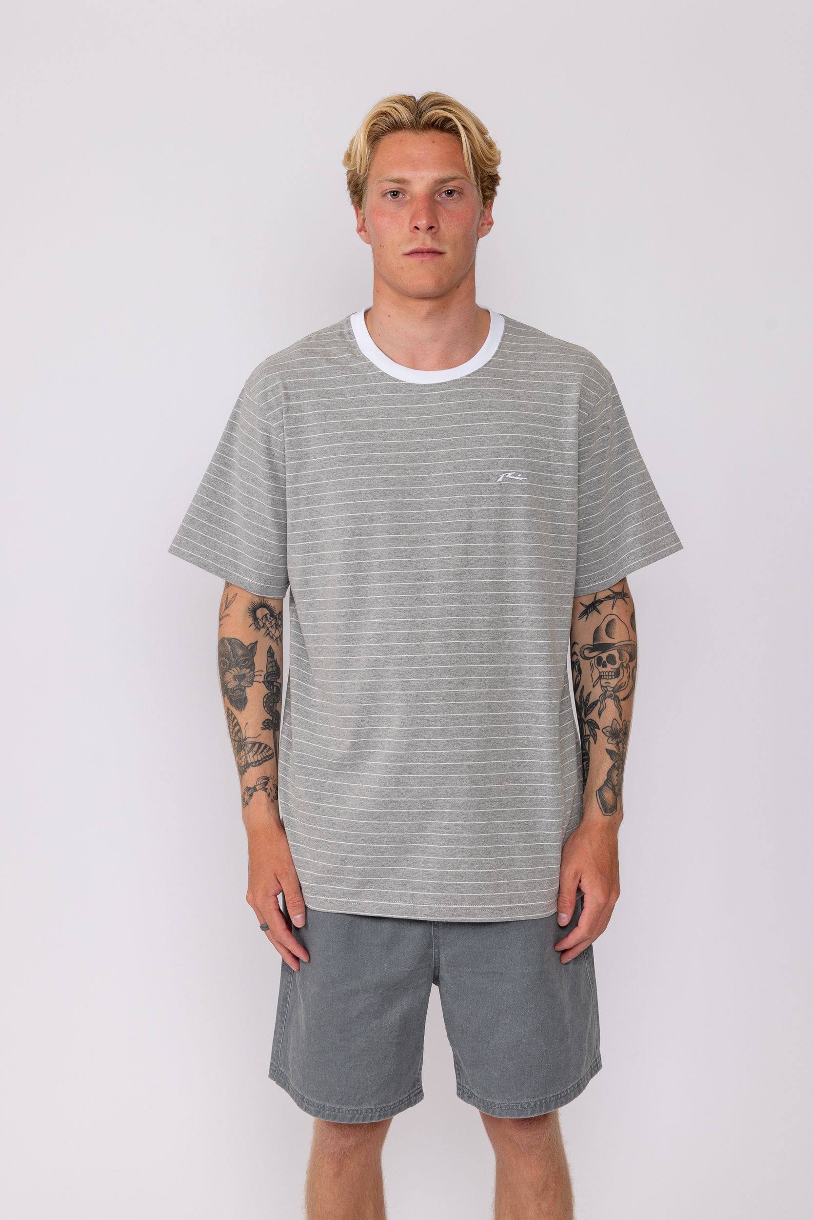 Short-sleeved, striped T-shirt with contrast collar and Rusty embroidery on the front. Materials: 95% cot ton / 5% spandex